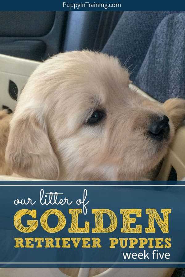 I’m surprised that there is a such a difference in weight so early on! 1 lb difference is a lot for a little 4-5 lb. puppy. So interesting! And great idea taking the puppies in the car so early. My friend got a foster dog and he threw up all over the car…I assume the dog didn’t ride in the car when he was little. 🙂 Probably more comforting for the puppies with their brothers and sisters in the car with them. Can’t wait to see what week 6 is like!