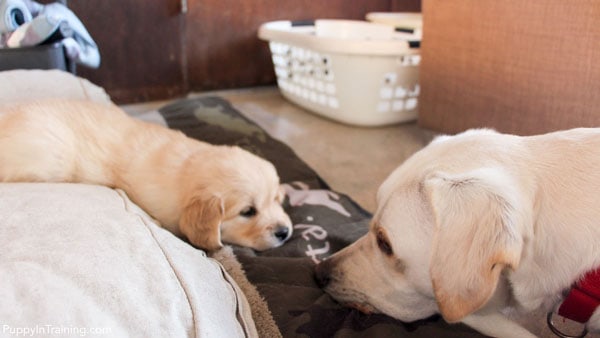 Archer was very curious since day 1, but even though he and Raven were best pals she still was protective of her puppies.