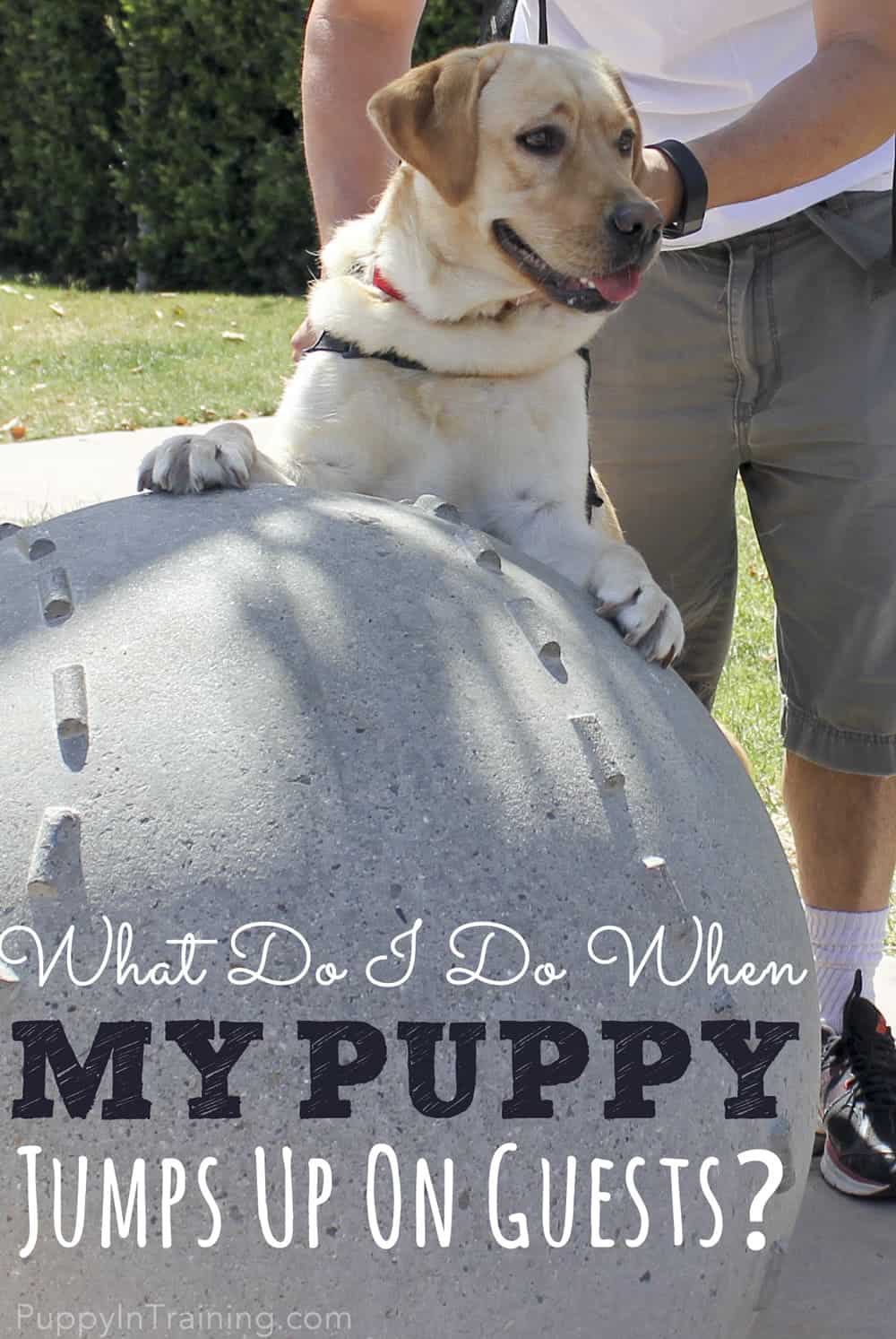 “When people come over my dog jumps up on them as soon as they walk through the front door. What do I do to get my dog to stop jumping up on guests?”
