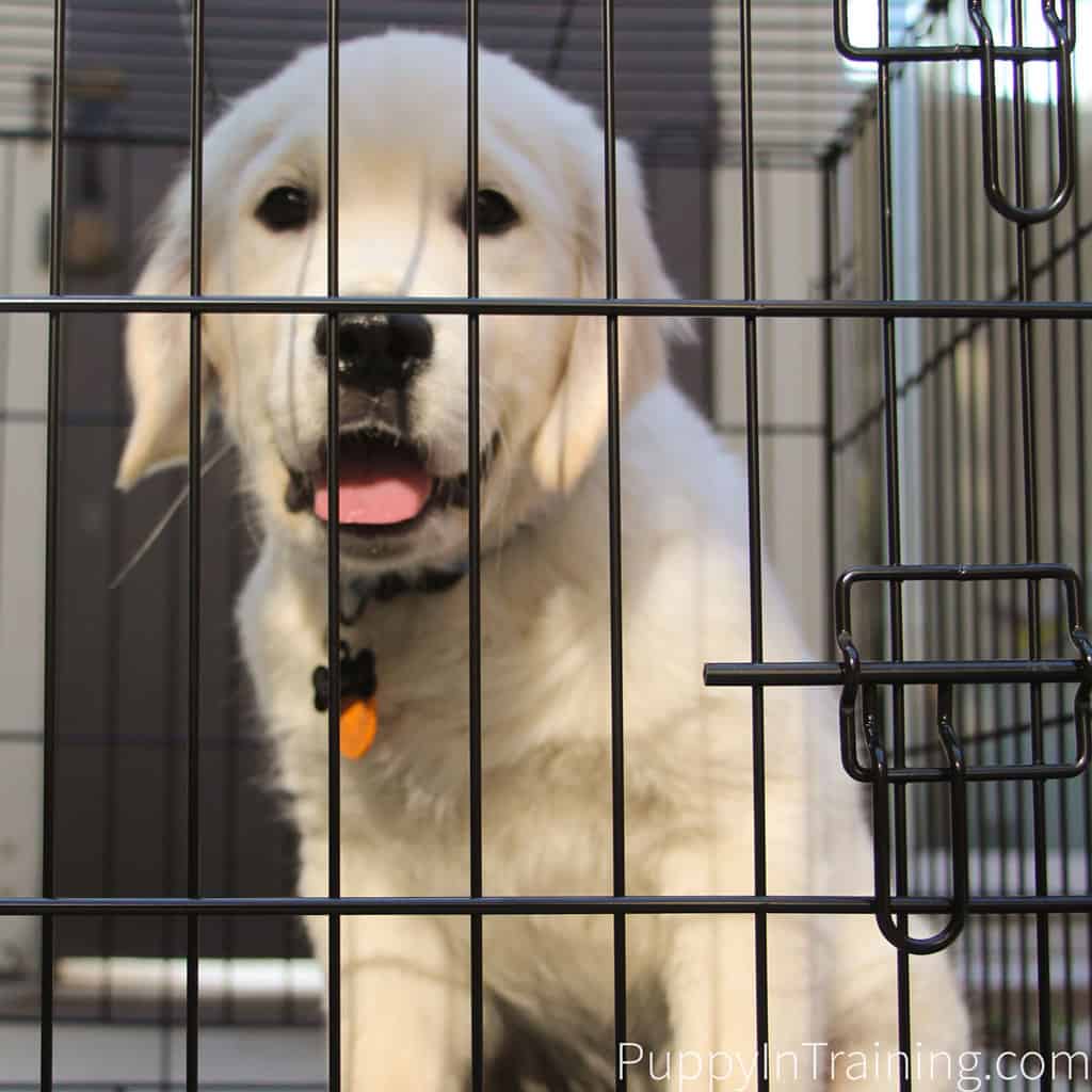 - Get a large crate with a divider so you can increase the size of the crate as your puppy grows. We like our Carlson Double Door Crate w/ Divider.